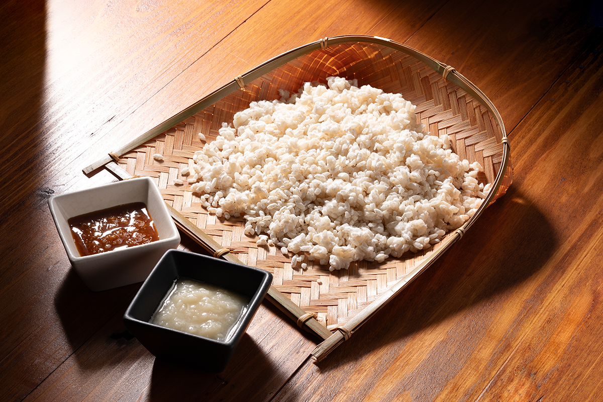 甘酒用と味噌用と2種類の糀を作っています。甘酒や塩糀用は、粒が口に残らない仕上がりでお料理にも幅広く応用できます。