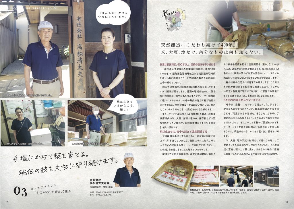 (社)加古川観光協会から発行されている“ふるさと納税返礼品”の参加業者を紹介した冊子「カコガワクラフト」で弊社、高松清太夫老舗が掲載され、創業の歴史や、味噌・麹の製造に関する秘話をが紹介されています。また商品は加古川駅構内の観光案内所内「ふるさと納税返礼品」紹介ブースでも展示されています。ぜひお立ち寄りください。