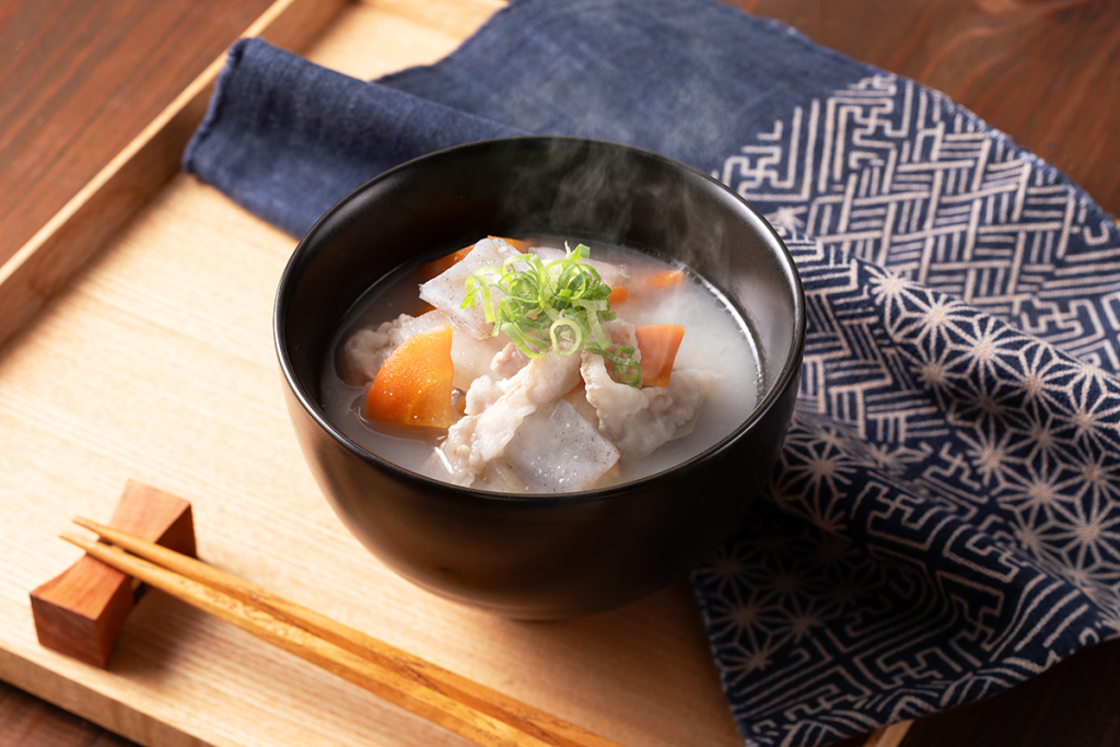 具材をひと口大に切る。ご家庭のそれぞれの作り方で豚汁を。最後に、白味噌を溶き入れ、蓋なしで弱火で5分ほど煮ると、いつもの豚汁が京風の上品な逸品に。器に盛り、青ネギを散らしお好みで七味を。