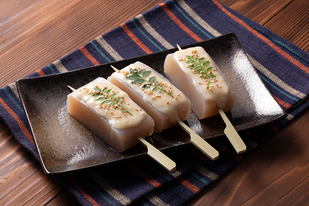 こんにゃくを茹でる。〈A〉を耐熱容器に入れて混ぜ、電子レンジでラップをかけずに加熱。全体が泡立ったらよく混ぜ、味噌にとろみがつくまで3回繰り返す。串を刺したこんにゃくに〈A〉を塗り、お好みで木の芽やゴマを。