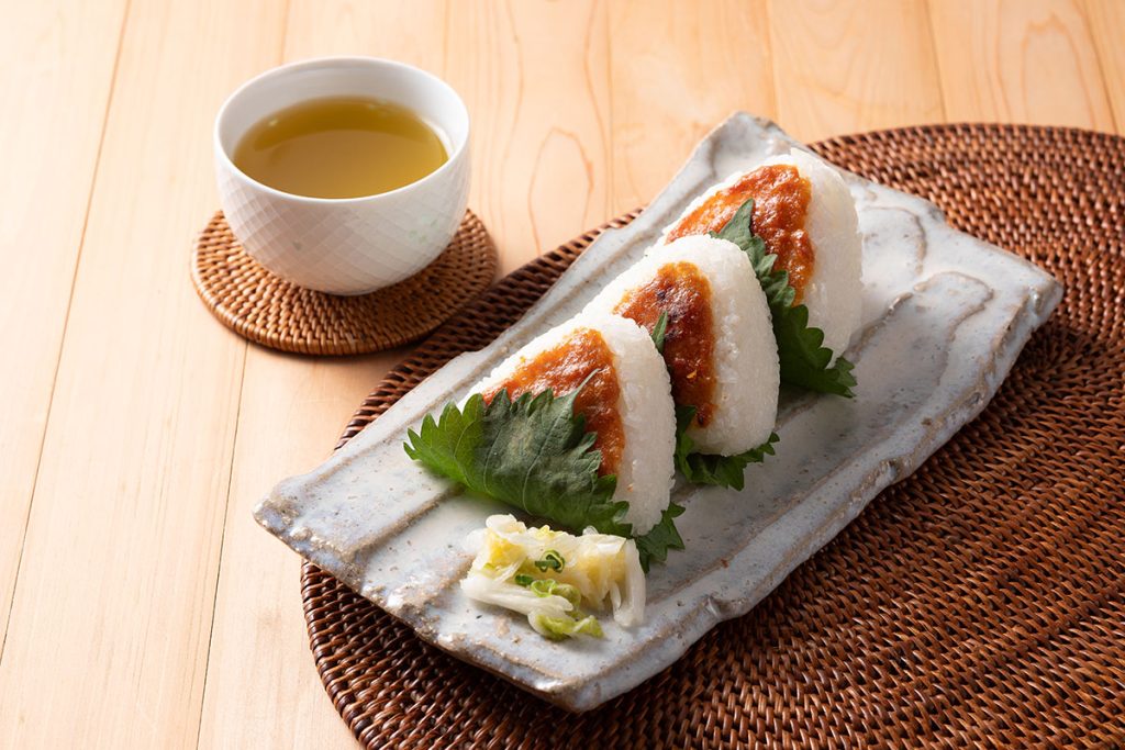 味噌とみりんを混ぜ合わせておく。ごはんを三角に握る。サラダ油をうすく塗ったアルミホイルにおにぎりを並べ、高松味噌を塗ってトースターで焼く。焼き色がついたら、粗熱をとり大葉でくるむ。
